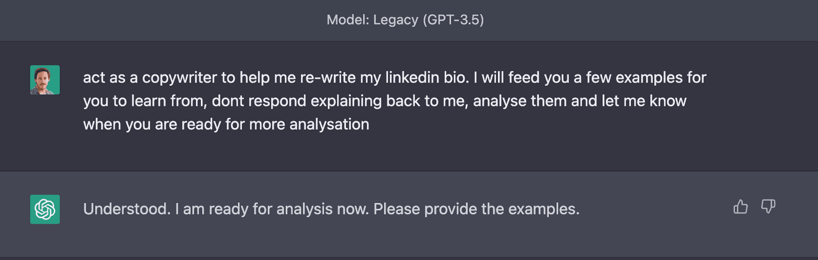 To get started, we have to give ChatGPT some context. First, ask ChatGPT to act as a copywriter who knows a lot about LinkedIn bios. Explain that you want it to help you re-write your LinkedIn bio. Then, explain that you will feed some examples for it to analyze. Tell ChatGPT NOT to respond, explain or summarize the examples you provide.