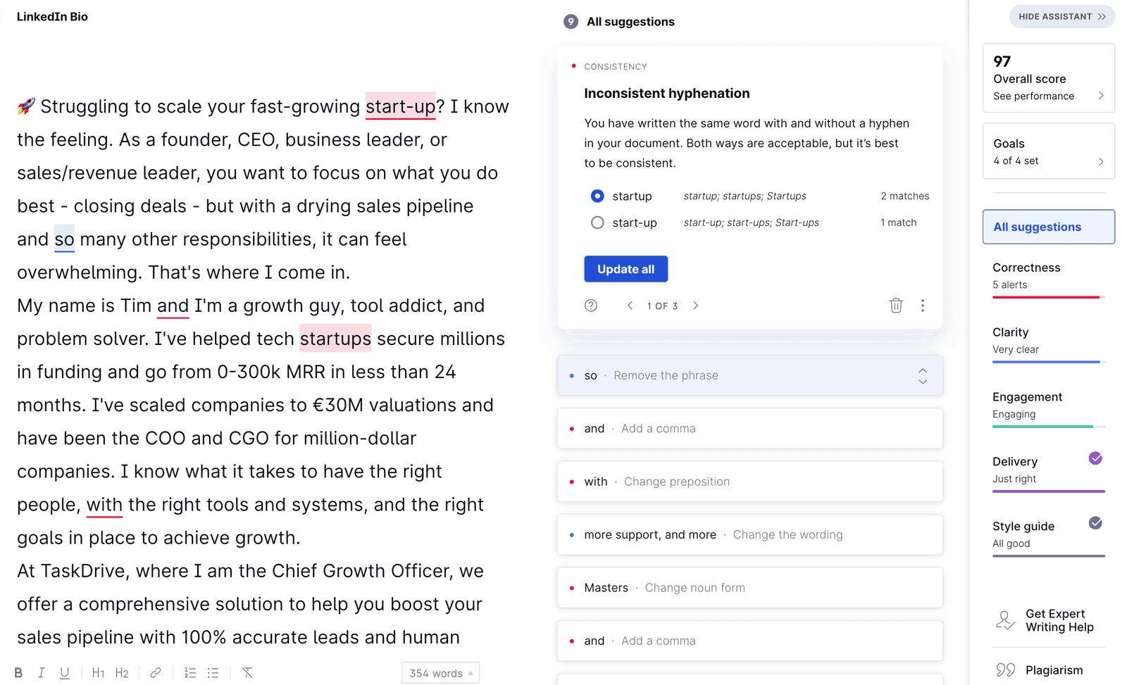 At some point, you’ll want to take your draft out of ChatGPT and into a document editor. Here you’ll put the final touches to your bio and you can use a tool like Grammarly to check your grammar, spelling and tone.