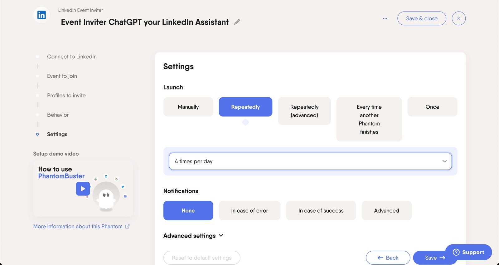 Go to the “Settings” tab for your LinkedIn Event Inviter Phantom.
